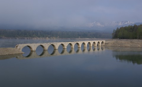 ダムの水が少ない1月頃から凍結した湖面にその姿を現わし、水位が上昇する5月頃から沈み始め、夏頃には湖底に沈みます。このように、季節によってその姿が見え隠れするアーチ橋は日本でここだけで、それが幻の橋といわれる所以です。