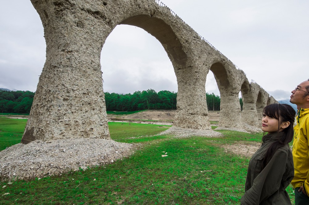 ダムの水が少ない1月頃から凍結した湖面にその姿を現わし、水位が上昇する5月頃から沈み始め、夏頃には湖底に沈みます。このように、季節によってその姿が見え隠れするアーチ橋は日本でここだけで、それが幻の橋といわれる所以です。