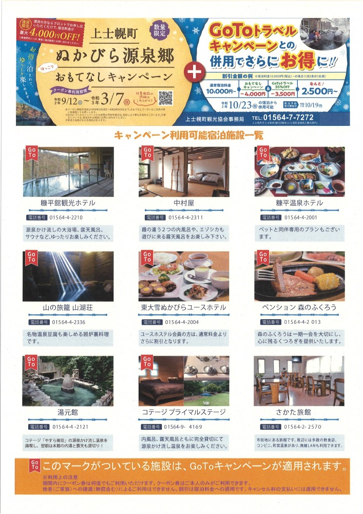 現在実施中の道民限定上士幌町ぬかびら源泉郷おもてなしキャンペーンが10月23日宿泊分からGoToキャンペーンと併用可能となります。(※予約受付は10月19日からです)