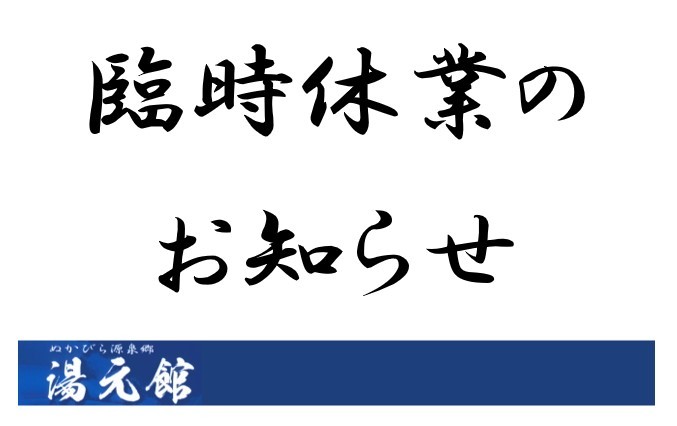 ぬかびら源泉郷 湯元館でございます。 この度、設備工事のため下記の期間の日帰り入浴を休止いたします。 ご迷惑をおかけしますが、何卒よろしくお願い申し上げます。 ・日帰り入浴休止期間 2025年11月7日(金)から11月14日(金)まで